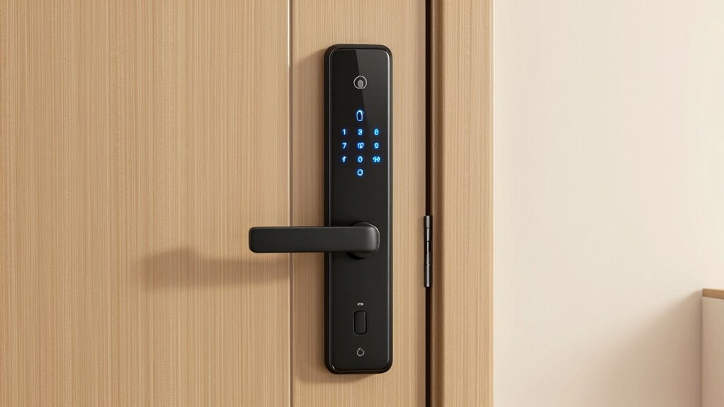 Choosing the right opening methods can considerably enhance both security and convenience for your apartment door. With options like fingerprint scans, keypads, app control, mechanical keys, and voice commands, you can select methods that fit your lifestyle and needs. Multi-method locks offer flexibility, supporting remote management so you can secure or open your door via smartphone even when you’re away. Biometric recognition, such as fingerprint scanning, provides quick, secure access—sometimes in as little as 0.3 seconds. Keypads with customizable codes are perfect for temporary access or sharing with trusted visitors. Combining multiple unlocking methods not only boosts security but also makes access more adaptable during emergencies or when multiple users are involved. This variety ensures you find a smart lock that balances convenience and security seamlessly.