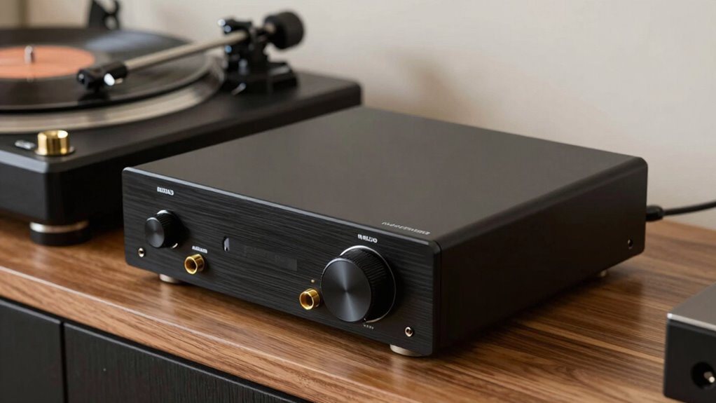 Achieving high sound quality in a solid state phono preamp hinges on several key factors that influence detail and clarity. A top priority is a high Signal-to-Noise Ratio (SNR) of 89dB or higher, which ensures minimal background noise and clear, detailed audio. Adhering to RIAA standards guarantees accurate sound reproduction during equalization, preserving fidelity. Low-noise circuitry design reduces interference, resulting in cleaner sound. The quality of components like capacitors and resistors plays a crucial role in maintaining signal integrity and minimizing distortion. Additionally, proper channel separation through dedicated left and right amplification stages enhances stereo imaging, providing precise and immersive sound. Together, these standards set the foundation for a preamp that delivers exceptional detail and clarity in your listening experience.