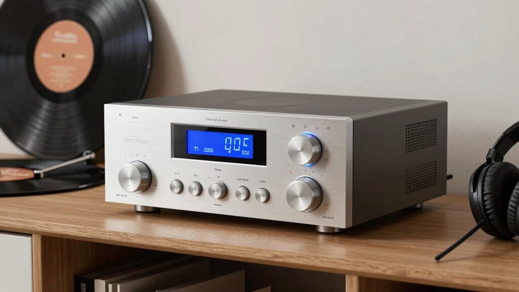 Like a modern-day TARDIS, many stereo receivers now seamlessly integrate with smart home systems. I’ve found that most models support Wi-Fi, Bluetooth, or even protocols like Alexa or Google Assistant. You can control your music, switch inputs, or set schedules from your smartphone or voice commands. Just verify your receiver has the right connectivity options, and you’ll enjoy a smart, harmonious audio setup that feels almost futuristic.