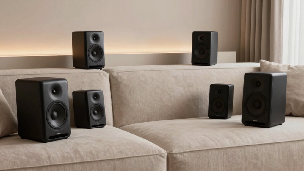 Choosing the right surround speakers for small rooms requires careful space planning to avoid clutter and maximize functionality. I recommend selecting compact, slim-profile speakers that can be mounted on walls or placed on shelves to save space. In-wall or in-ceiling options are excellent for creating a clean, unobtrusive look, freeing up valuable floor and shelf area. Using adjustable wall brackets and mounting hardware allows you to position speakers at ideal angles without taking up additional space. Opt for speakers with a low footprint and versatile placement options to prevent overcrowding. Wireless surround speakers also make a great choice, reducing cable clutter and offering flexible positioning tailored to your room layout. These tips help you maintain a tidy, efficient setup without compromising sound quality.