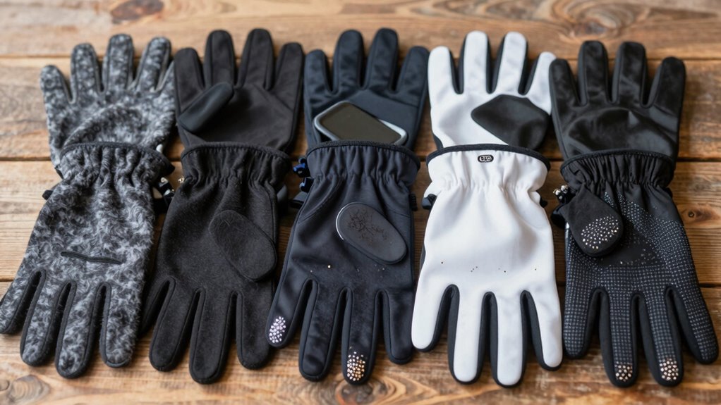 Choosing gloves that keep your hands warm depends heavily on their insulation and warmth features. Effective insulation materials like fleece, wool, or thermal linings trap heat and prevent cold from penetrating. The thickness and density of the insulation layer directly influence how well gloves retain warmth during extended outdoor use. A windproof and water-resistant outer shell enhances insulation by blocking cold air and moisture from reaching your skin. Breathable insulation is also vital, as it allows sweat to escape, reducing the risk of chilling from moisture buildup. Proper fit ensures that insulation layers stay snugly in place, minimizing gaps where heat could escape. When selecting touchscreen gloves, prioritize insulation that balances warmth with breathability for ideal comfort in cold conditions.