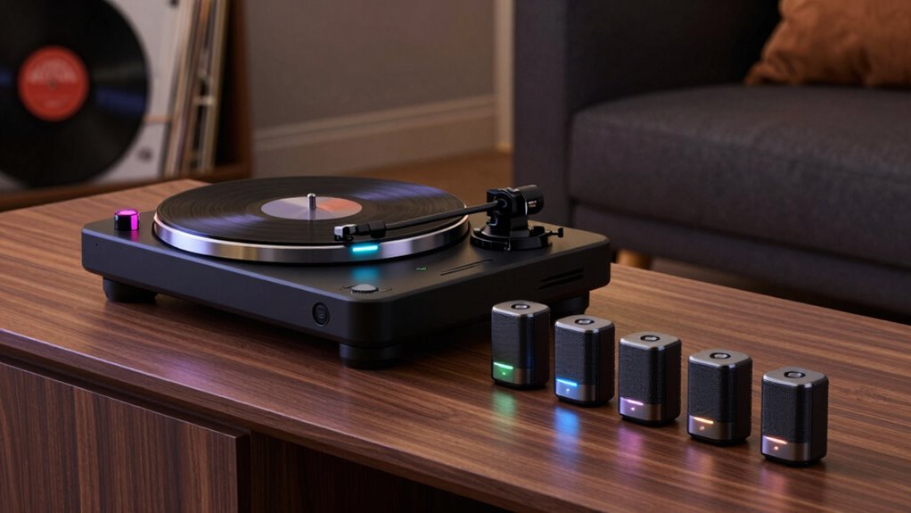 To improve audio quality with wireless transmission, I recommend using a high-quality Bluetooth transmitter that supports aptX or AAC codecs, which reduce latency and enhance sound clarity. I also make sure my turntable’s Bluetooth connection is stable, minimize interference from other devices, and keep the transmitter and receiver close. Upgrading to a better transmitter and ensuring a strong, interference-free signal really makes a noticeable difference in sound quality.