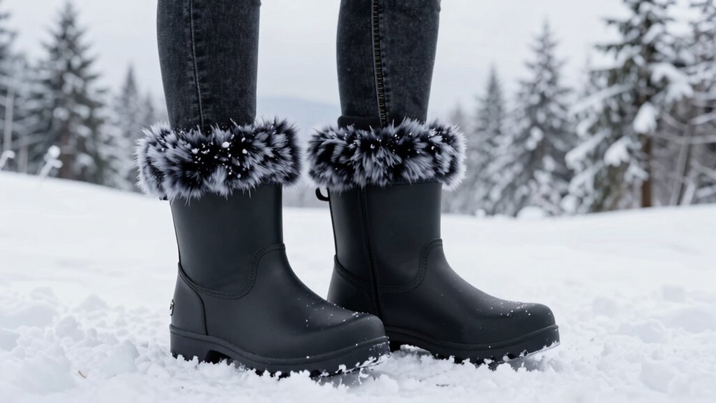 Since insulation directly impacts how well your snow boots retain heat, it’s essential to take into account its material, thickness, and placement. Materials like 200g 3M Thinsulate or faux fur linings are excellent for trapping warmth and keeping feet dry. Thicker insulation generally offers better warmth but can add bulk, so it’s important to balance warmth with comfort. The thermal rating should match the climate you’ll be in, ensuring your feet stay warm in harsher conditions. Additionally, insulation that wicks moisture prevents sweat buildup, maintaining dryness and warmth. Proper placement and quality—such as full lining or strategically padded areas—are key, as they eliminate cold spots and maximize overall insulation efficiency. Choosing the right insulation means staying cozy even in the coldest weather.