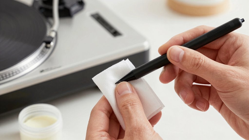 Over time, dust and debris can accumulate on your stylus, affecting sound quality and record preservation. Regular stylus maintenance isn’t just about keeping your records sounding their best—it also extends the lifespan of your stylus and cartridge. The key to effective cleaning lies in using the right cleaning tools and techniques that won’t cause damage. Proper safety precautions include ensuring your turntable is powered off and unplugged before cleaning to prevent accidental damage or injury. Start by gathering the appropriate cleaning tools for your stylus. Soft brushes, stylus cleaning gels, and specialized cleaning pads are all designed specifically for this purpose. Avoid using household items like paper towels or rough cloths, which can scratch or dislodge the delicate stylus tip. A gentle brush with soft, fine bristles is often the best choice. You should use it to carefully sweep away dust and debris from the stylus tip, moving in the same direction as the stylus’s tip to avoid pushing particles deeper into the cantilever or damaging the stylus. When cleaning, make sure your turntable is powered off and unplugged to prevent accidental damage or injury. If you’re using a stylus cleaning gel, apply a small amount directly onto the stylus tip, then gently lift away dirt and grime as the gel traps debris. For brushes, lightly sweep the stylus without applying excessive pressure—pressing too hard can bend or break the delicate needle. If your stylus has a protective cover or guard, use it during cleaning to prevent accidental damage. Consistency is key. Incorporate stylus cleaning into your routine after every few listens or at least once a week if you’re a frequent listener. This routine maintenance prevents the buildup of dust, mold, or other contaminants that can impair sound quality. When using cleaning tools, always follow the manufacturer’s instructions for the best results. Some cleaning gels and brushes are designed for specific stylus types, so make sure you’re using compatible products. Remember, the goal is to remove dirt without risking damage to the stylus or its delicate components. Proper stylus maintenance, combined with careful cleaning tools and techniques, ensures your records stay pristine and your listening experience remains sharp and clear.